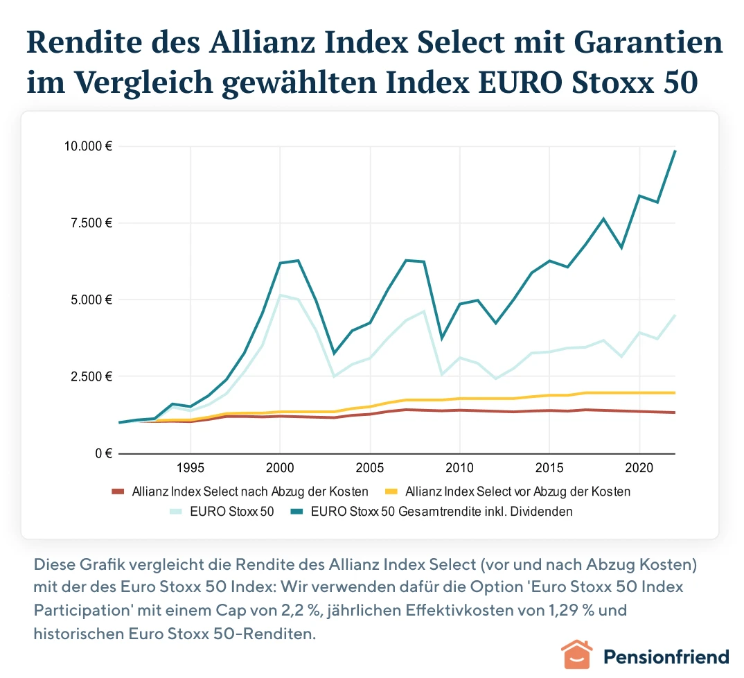 Es gibt auch komplexere private Rentenversicherungen, wie die Allianz Index Select, die abgeleitete Finanzstrategien nutzen, um höhere Renditen zu erzielen. In der Vergangenheit lagen die langfristigen Renditen dieser Strategien nach Abzug der Kosten im Bereich von 0 bis 2 %, lieferten also auch eher ernüchternde Ergebnisse. Diese Renditen sind zudem tendenziell rückläufig, da sie immer häufiger eingesetzt werden, und die Unternehmen, die solche Produkte anbieten, in Zukunft nicht mehr die gleichen Ergebnisse versprechen können. Die Garantien gelten zudem nur für die Renditen vor Abzugskosten. In diesem Artikel erläutern wir die Risiken dieser Produkte im Detail. In diesem Artikel erläutern wir die Schwächen von Rentenversicherungen mit garantierten Leistungen im Detail.