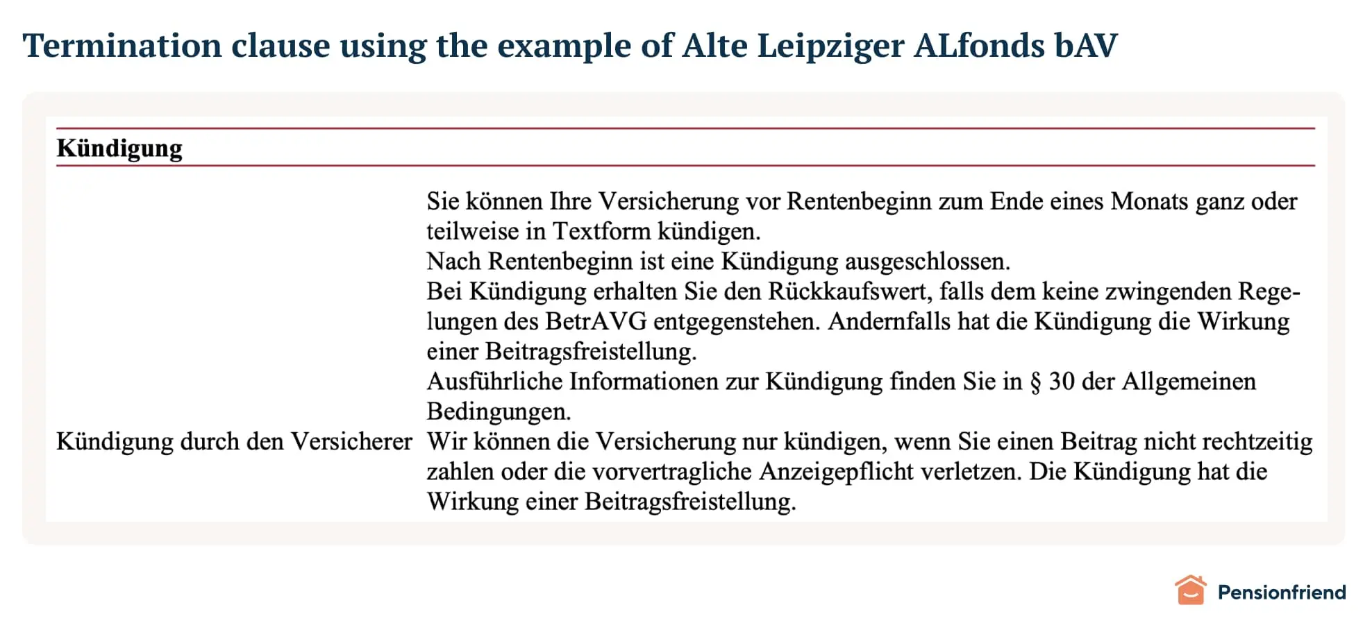 See below an example of an insurance contract. You can see that the actual contract states that the contract scheme can be terminated monthly. However, the value is only paid out if the regulations of the BetrAVG (the law that regulates company pension plans in Germany) allow this; hence, only if the value is lower than the threshold.