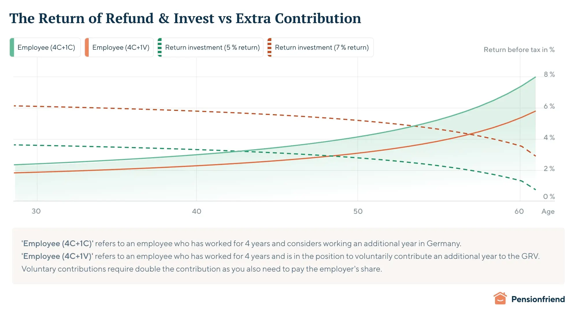 But the less successful you are in investing on your own, the younger the age at which you want to put in an extra year. For example, if you invest, say, just 75 % in stock and the rest in bonds and therefore get a compound return of about 5 %, then already at the age of 45, you are better off putting in that extra year rather than seeking a refund.
